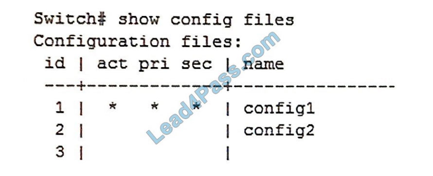 A network administrator views the configuration files on an ArubaOS switch and sees the output in the exhibit. The administrator enters this command: Switch# boot system flash primary config config2 After the switch boots, the administrator makes some configuration changes and saves the configuration with the write memory command. The administrator then enters this command: Switch# boot After the switch boots, the configuration changes just made are not present. How can the administrator restore the configuration with the changes? A. Use the boot set-default command to configure the switch to use the secondary software. Then reboot the switch. B. Reboot the switch and interrupt the boot process. Find the temporary file with the configuration changes and apply that file to the startup-config. C. Rename the config2 file to config1. Then reboot the switch. D. Use the startup-default command to configure the switch to use the config2 file with the primary software. Then reboot the switch. Correct Answer: D